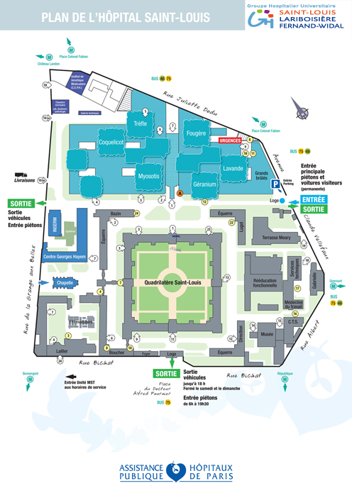 L’hôpital Saint-Louis est un hôpital de l’AP-HP situé à proximité de la Gare de l’Est, dans le 10ème arrondissement de Paris. Il assure une mission de proximité et une prise en charge spécialisée et de référence dans un grand nombre de disciplines médicales comme chirurgicales.Son expertise est reconnue au plan national et international en hématologie (maladies du sang et maladies associées) et cancérologie (cancer du sein, de l’appareil digestif, urologique), en dermatologie (onco-dermatologie et pathologies de l’inflammation cutanée) et réparations cutanées (chirurgie réparatrice et chirurgie plastique) ainsi que dans le domaine des greffes, d’organes et de moelle osseuse.